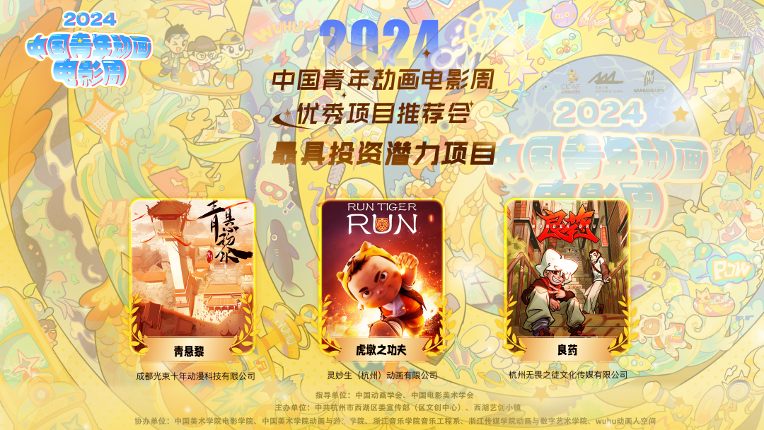 2024中国青年动画电影周于2024年5月26日-27日在杭州西湖艺创小镇举行,从动画人才(项目)评优推优和动画行业交流研讨两个维度,举办中国优秀动画项目推荐会、中国青年动画电影周开幕式、中国青年动画电影周导演创新交流会3个板块的活动内容。来自全国范围内的9个优质动画项目入围推介,评选出了3位最具投资潜力项目和6位优秀项目,中国青年动画电影周导演创新交流会邀请了国内一线动画导演、制片人、新锐人才精彩分享,在新浪微博、抖音、B站、视频号等主流网络平台同步直播。中国青年动画电影周旨在为行业动画人发声,促进产业跨界合作,为动画人打造一个展示作品的梦想舞台,这里见证创意的碰撞、智慧的交流,共同探索未来动画行业发展的无限可能。
