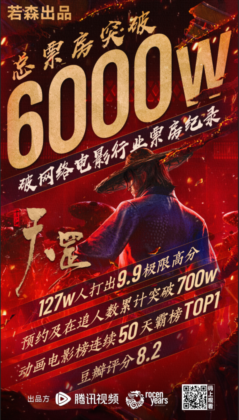 而《画江湖之天罡》作为《画江湖之不良人》系列的首部动画电影,于23年12月29日在腾讯视频云首发上映,总票房已突破6000万。
